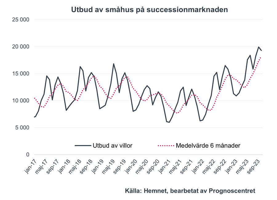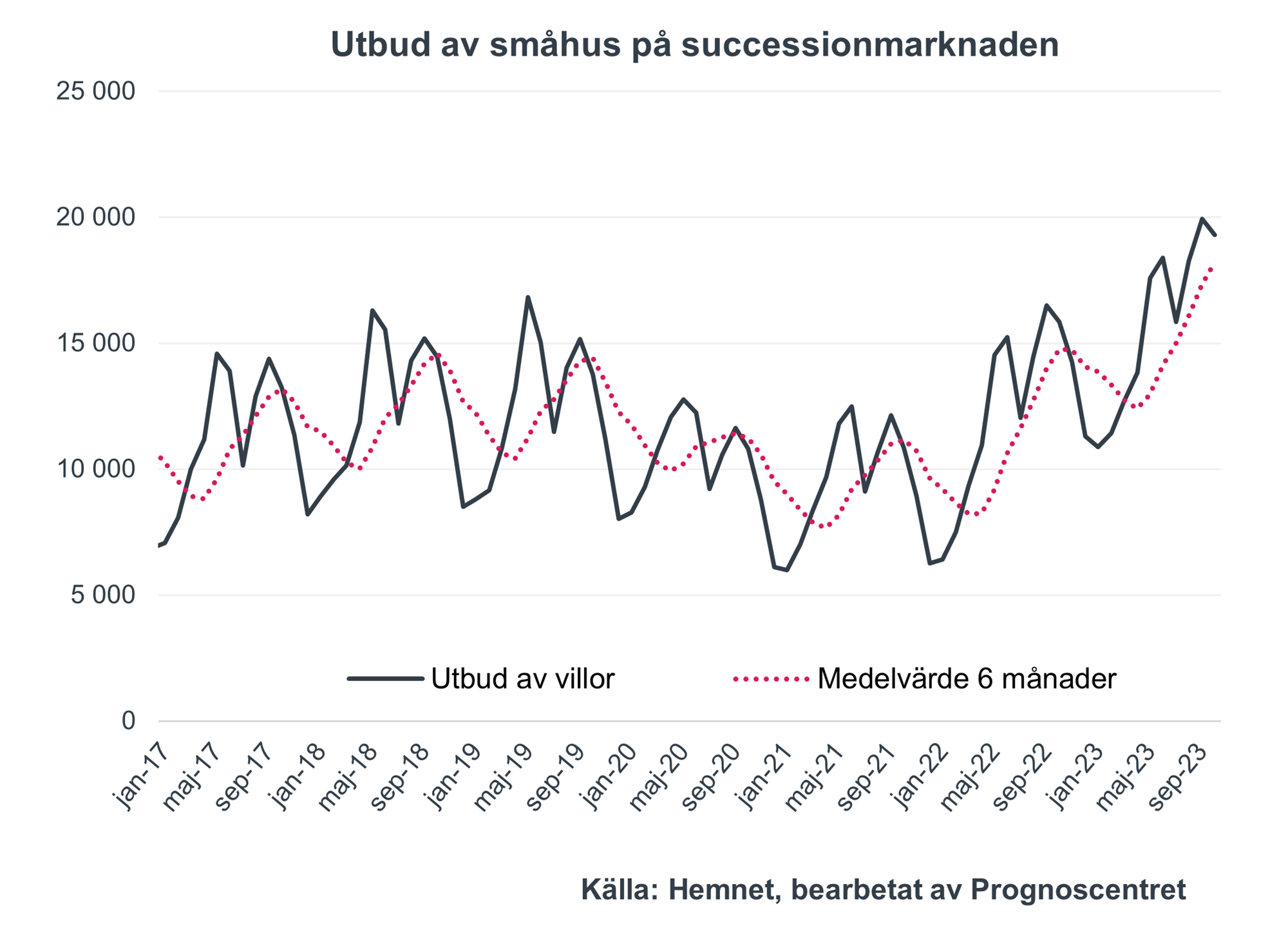 Utbudet av villor till salu uppgick i oktober till cirka 19 300, en minskning med 3 procent jämfört med september och en ökning med 22 procent jämfört med förra året.