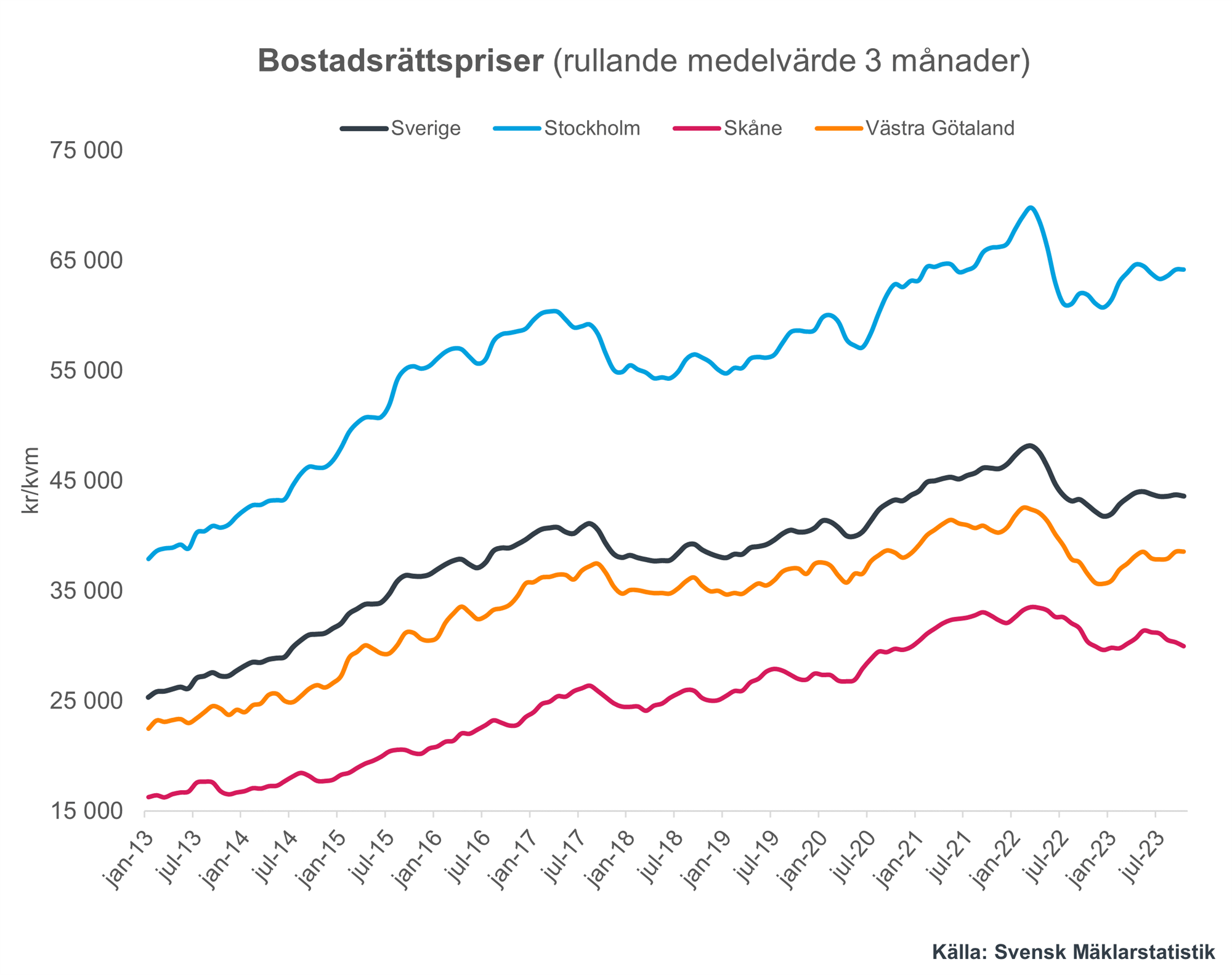 Priserna på bostadsrätter sett till hela landet sjönk med 0,3 procent mellan september och oktober, men ökade med 1,9 procent jämfört med i fjol. Av de tre storstadsområdena var priserna på månadsbasis oförändrade i både Stockholm och Västra Götaland samt sjönk med 1,2 procent i Skåne. På årsbasis steg priserna med 3,7 procent i Stockholm och med 5,5 procent i Västra Götaland. I Skåne backade priserna med 1,4 procent.