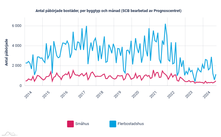 Fördelat på byggnadstyp så påbörjades drygt 1 150 lägenheter och knappt 500 småhus i september, vilket är 30 procent färre lägenheter men 40 procent fler småhus jämfört med september 2023. Jan-sept ökade antalet påbörjade lägenheter med 38 procent jämfört med i fjol medan småhusen under samma period minskade med 13 procent.