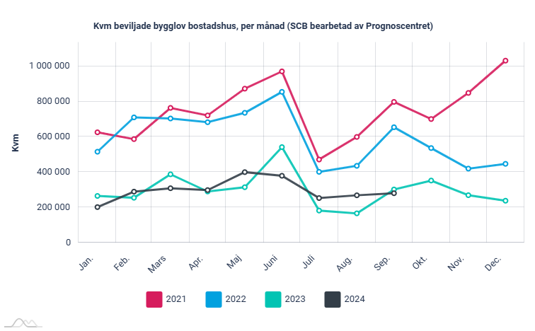 Beviljade bygglov för bostadshus (inkl. fritidshus) uppgick i september till drygt 280 000 kvadratmeter, vilket är 7 procent lägre än motsvarande månad förra året. Under jan-sept 2024 så uppgick byggloven till drygt 2 680 000 kvadratmeter, en minskning med 1 procent jämfört med motsvarande period 2023.