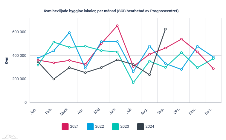 I september beviljades en areal om knappt 628 000 kvadratmeter lokaler, en ökning med 109 procent eller 327 000 kvadratmeter jämfört med september 2023. Under jan-sept uppgick beviljade bygglov till sammanlagt 2 959 000 kvadratmeter, vilket är en minskning med 15 procent jämfört med de cirka 3,5 miljoner kvadratmeter som beviljades under motsvarande period 2023.