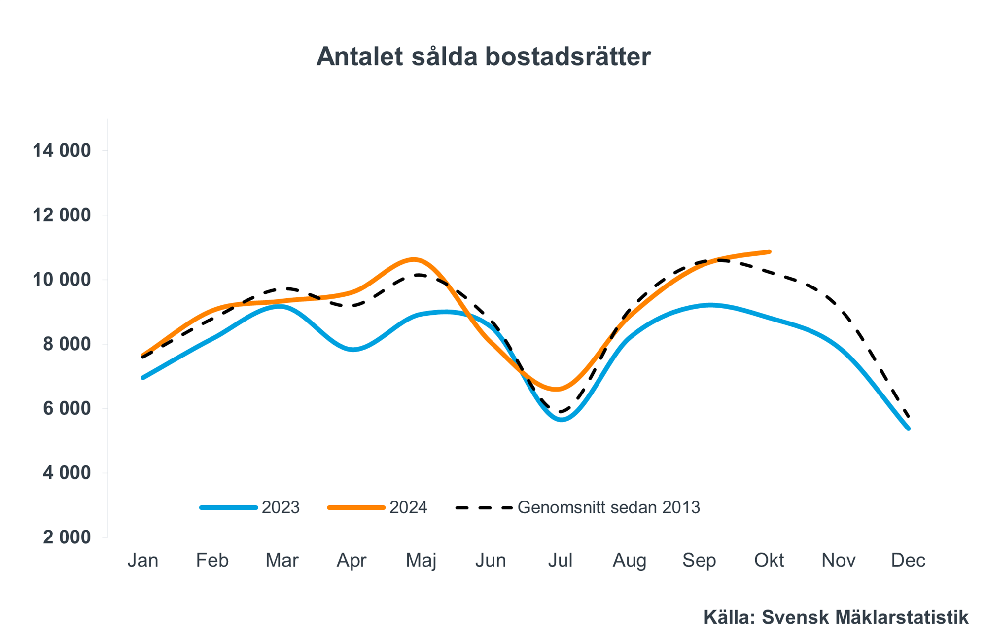 Antalet sålda bostadsrätter i oktober månad landade på knappt 10 900, vilket är 23 procent fler än motsvarande månad i fjol och 4 procent fler än i september. Antalet är något fler än den genomsnittliga nivån för månaden sedan 2013 (10 250).