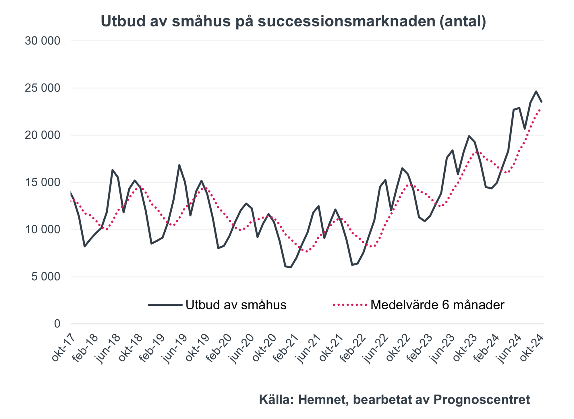 Hemnets utbud av villor uppgick i oktober till drygt 23 500 vilket är 22 procent högre än i fjol men 4 procent lägre än månaden innan.