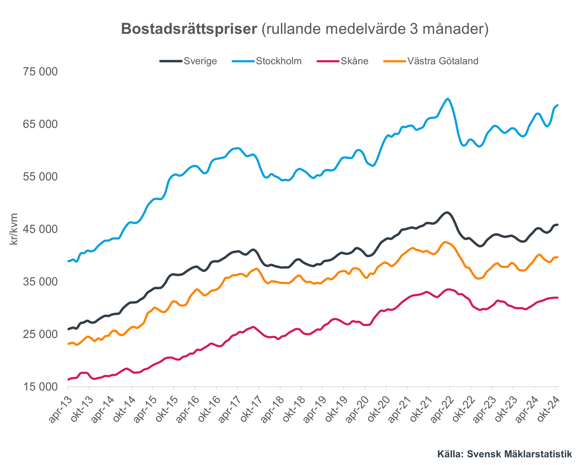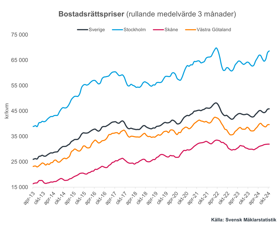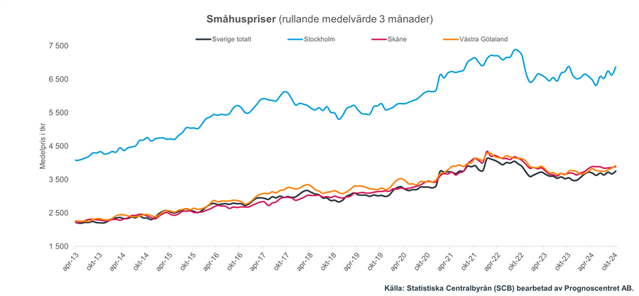 Ser vi till prisutvecklingen under oktober 2024 jämfört med oktober 2023 i de olika storstadsregionerna så steg priserna i Västra Götaland med 3,8 procent, i Skåne med 6,5 procent samt i Stockholm med 7,2 procent. Motsvarande siffror vid jämförelse med månaden innan är för Västra Götaland en uppgång med 0,3 procent, för Skåne stillastående priser och till sist Stockholm en uppgång med 1,1 procent.