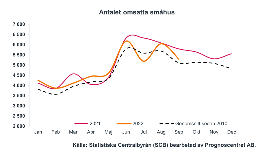 Antalet sålda småhus minskade i september med 9 procent jämfört med samma månad 2021. Jämfört med augusti i år minskade försäljningarna med 12 procent. Nivån är dock högre jämfört med samma månad 2019 och 2020.