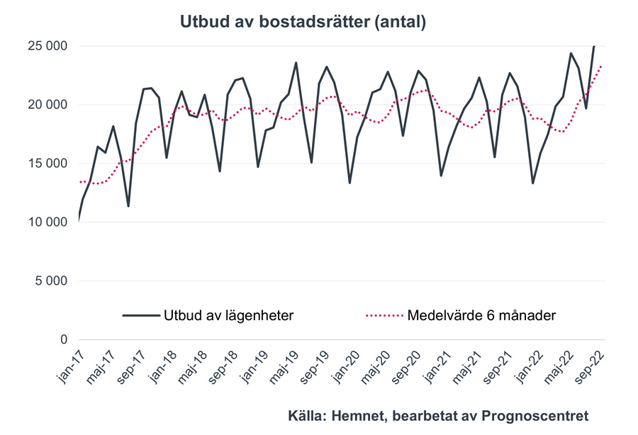 Utbudet av lägenheter ökade med 20 procent jämfört samma månad i fjol, och med 10 procent jämfört med augusti i år. Det totala utbudet uppgick till drygt 27 000.