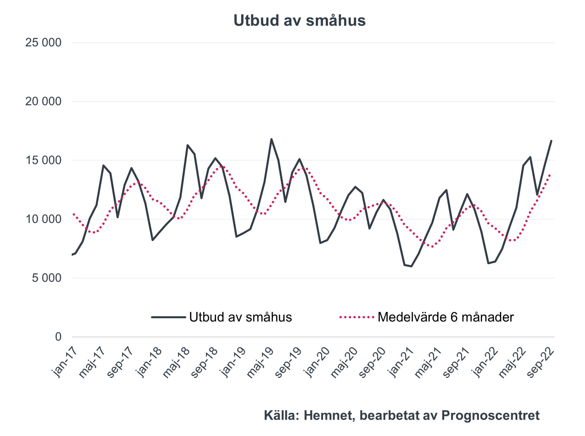 Utbudet av småhus uppgick till cirka 17 000, en ökning med 37 procent jämfört med september i fjol och en ökning med 15 procent jämfört med augusti i år.