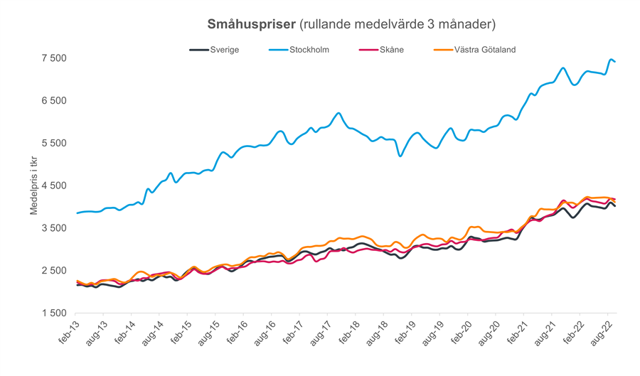 I september ökade bostadsrättspriserna i landet med 0,81 procent. Jämfört med samma månad i fjol minskade dock priserna med 5,8 procent. I Stockholms län ökade priserna med 1,5 procent jämfört med i augusti men jämfört med september 2021 har priserna minskat med 5,8 procent. Motsvarande siffror för Västra Götalands län var en ökning på 0,92 procent jämfört med augusti och jämfört med september 2021 en minskning på 6,6 procent. För Skåne län ökade priserna med 0,23 procent jämfört med augusti och jämfört med september 2021 en minskning på 2,9 procent.