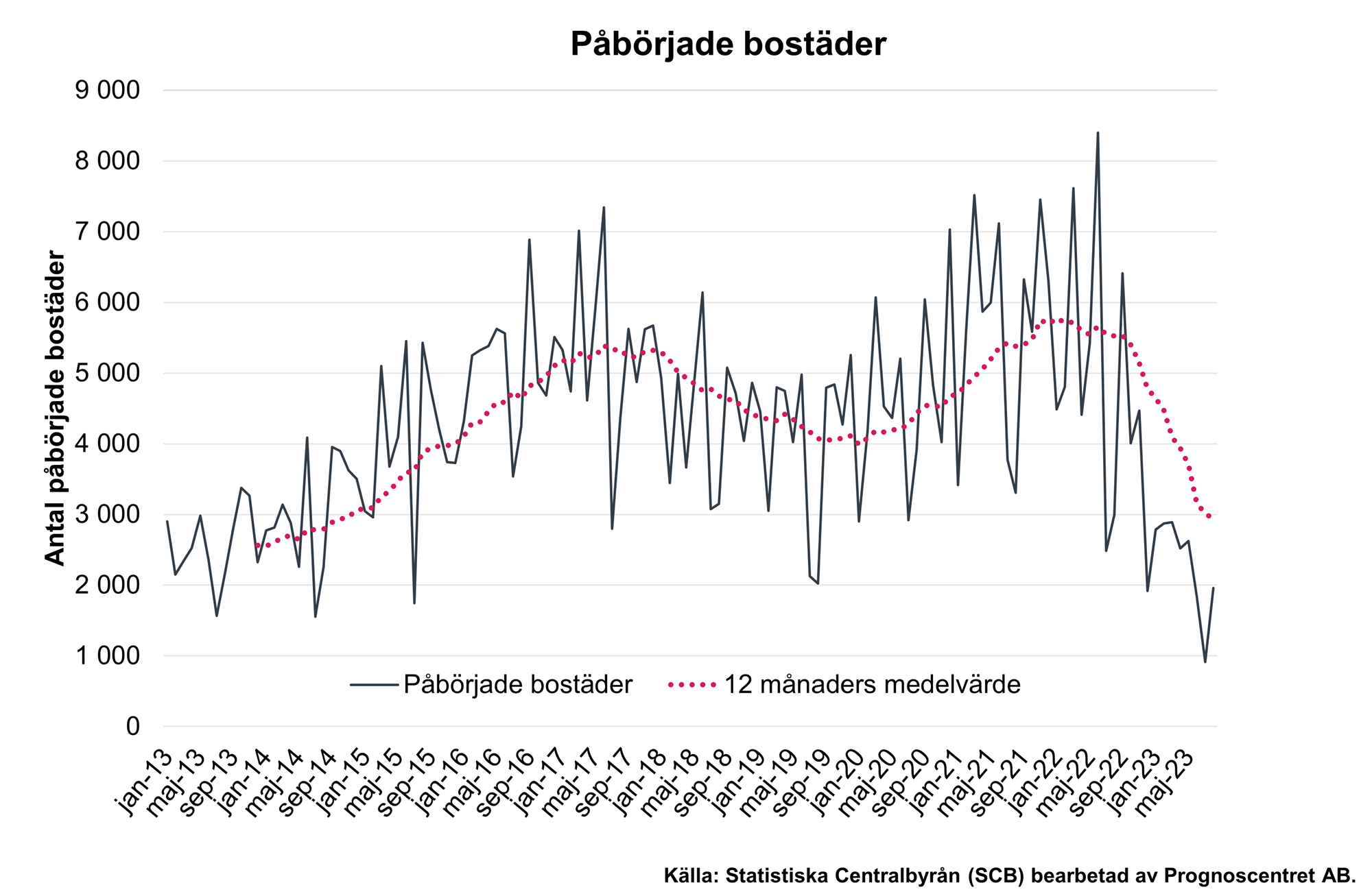 I augusti uppgick antalet påbörjade bostäder till cirka 1 950 vilket är en tapp med 35 procent jämfört med året innan. Från januari till augusti påbörjades totalt 18 400 bostäder - en minskning med 55 procent eller 22 000 bostäder jämfört med samma period förra året.