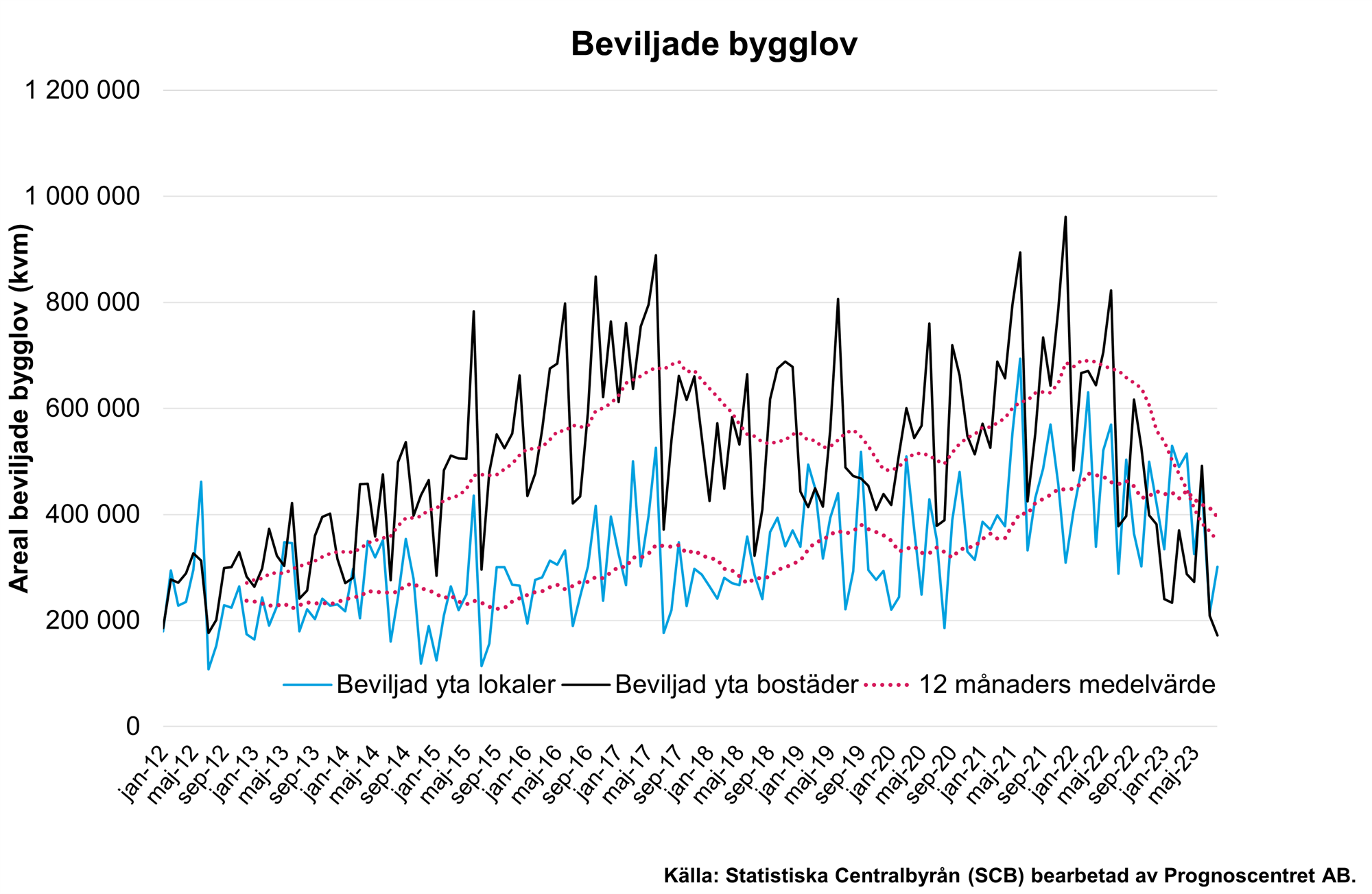 Beviljade bygglov för lokaler minskade i augusti jämfört med 2022 med 40 procent, ned till ca 300 000 kvadratmeter. Per augusti hade det sammanlagt under året beviljats cirka 3 160 000 kvadratmeter, en nedgång på 15 procent jämfört med i fjol.