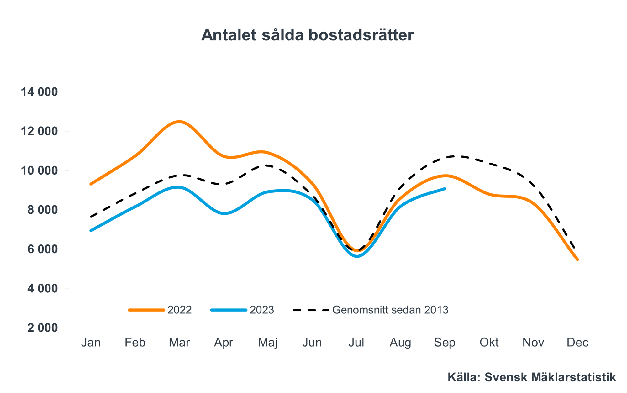Antalet lägenhetsförsäljningar uppgick under september till drygt 9 000, vilket är 7 procent lägre jämfört med samma månad i fjol. Jämfört med månaden innan var det en ökning med 11 procent. Det historiska genomsnittet för antalet försäljningar under månaden ligger på cirka 10 700.
