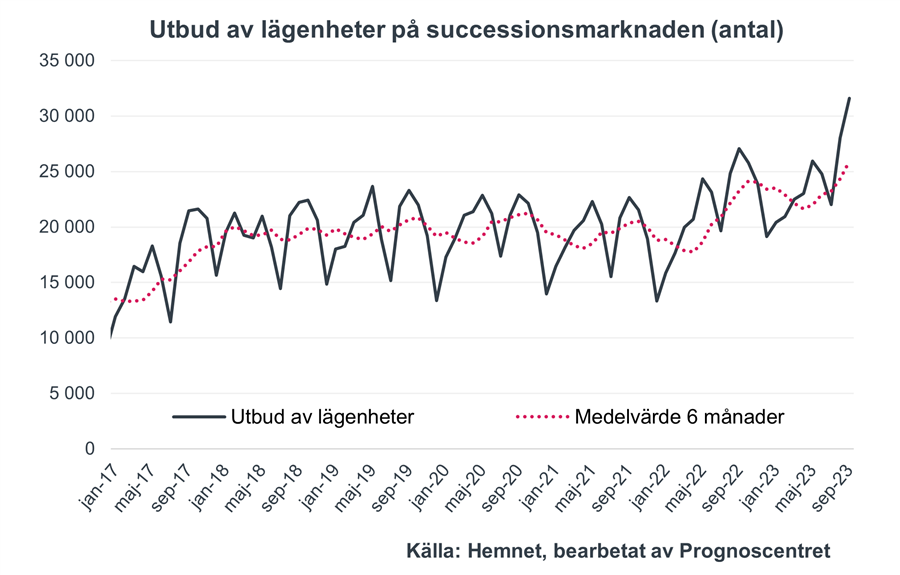 Hemnets senaste statistik för successionsmarknaden avseende september, vilket inkluderar såväl bostäder till salu samt kommande objekt, visar att lägenhetsutbudet uppgick till 31 600, vilket är en ökning med 13 procent jämfört med augusti och en ökning med 17 procent vid jämförelse av samma månad i fjol.