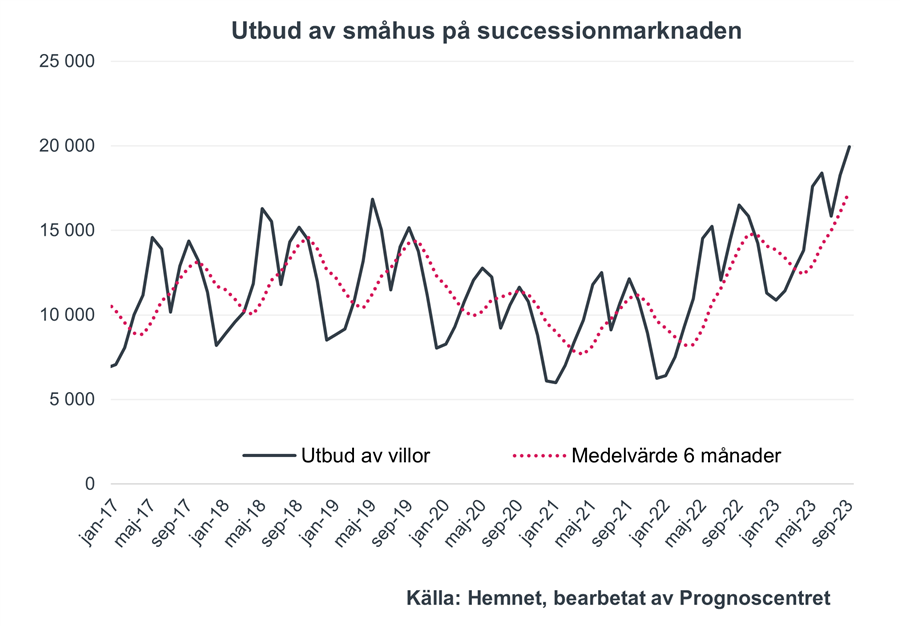 Utbudet av villor uppgick till nästan 20 000 under september vilket är en uppgång med 9 procent jämfört med månaden innan resp. 21 procent jämfört med förra året.