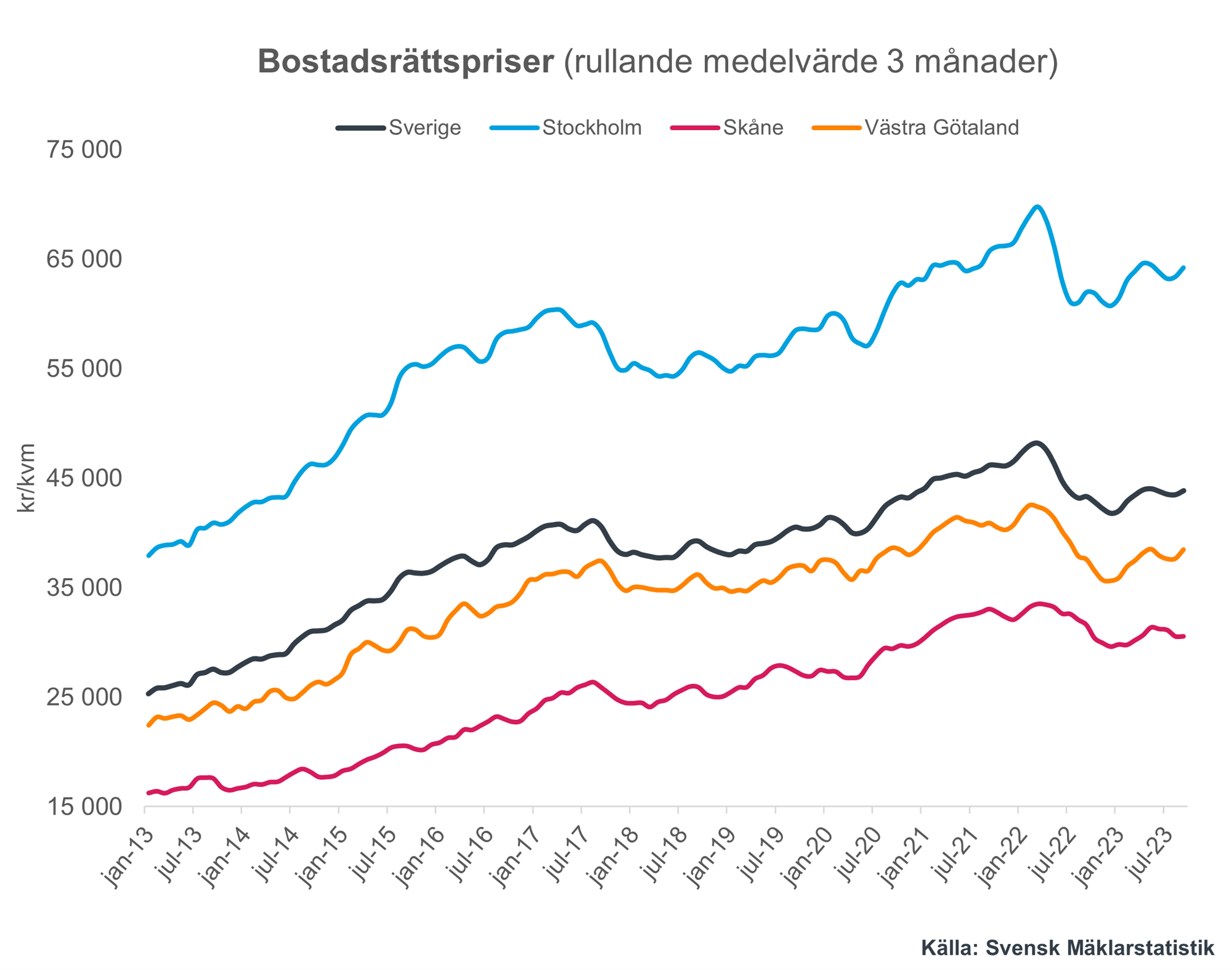 Priserna på bostadsrätter i landet steg med 1,2 procent under september jämfört med i fjol, och med 0,8 procent jämfört med månaden innan. Av de tre storstadsområdena så steg priserna under den senaste 12-månadersperioden mest i Stockholms län, där uppgången hamnade på 3,6 procent. I Västra Götaland var uppgången 2,4 procent och i Skåne län sjönk priserna med 3,3 procent.