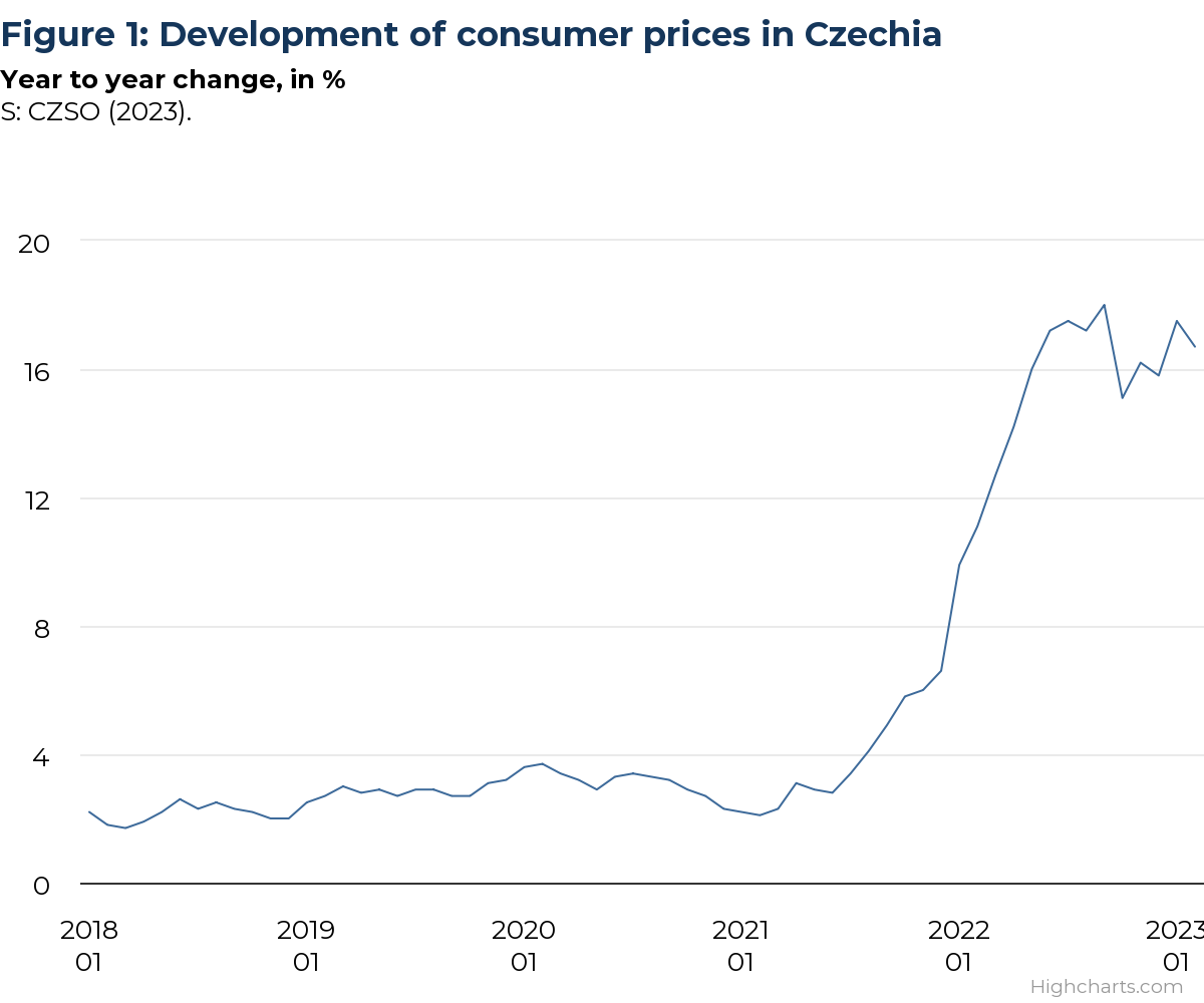 The war in Ukraine has pushed inflation into double digits. The average inflation rate for the year reached 15.1%, clearly the highest level since 1993, when the independent Czechia was founded and its economy was in the process of being transformed into a market economy. Czechia was among the five EU countries with the highest inflation rates from 2022 onwards (together with Hungary and the Baltic countries). Double-digit inflation is expected to continue in the coming months.