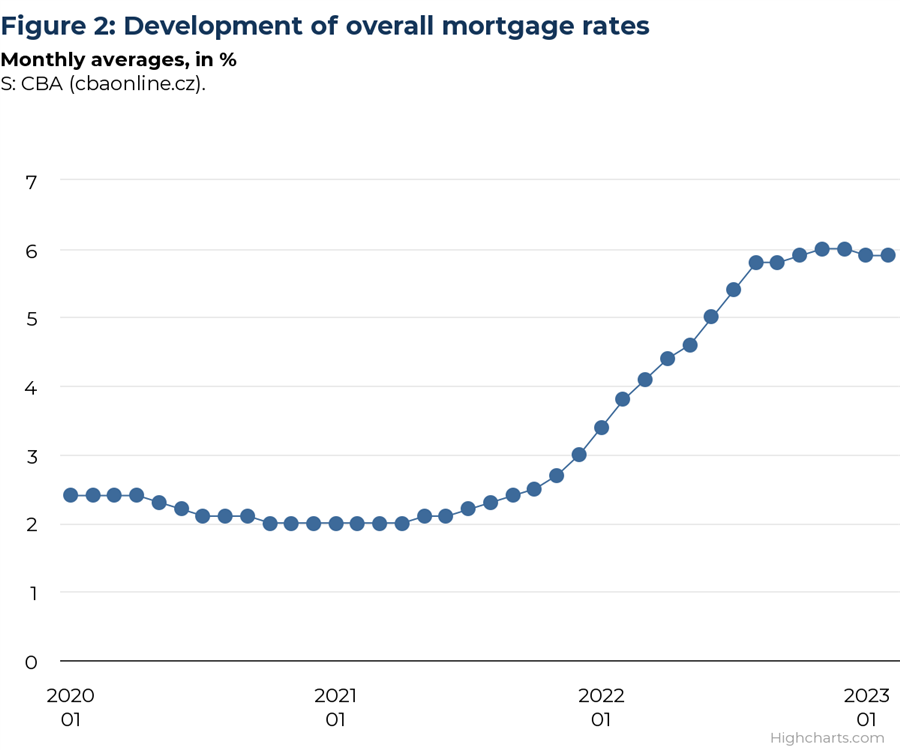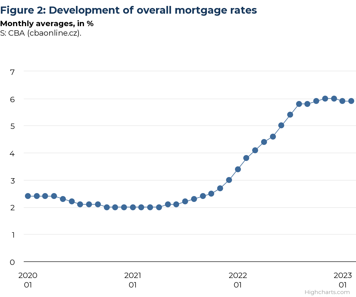 The Czech National Bank responded by sharply raising the two-week base rate. It rose from 0.25% in mid-2021 to 7.0% in about a year. This made loans, including mortgages, more expensive. The current mortgage rate is around 6%.