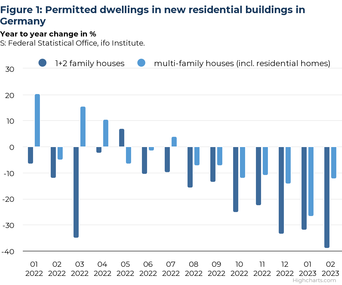 In the first two months of 2023, the shown development of the rates of change is now inconsistent between the two building types. However, this is again likely to have to do with the approval activity in the previous year. Apart from that, on the basis of the more recent values, only around 75,000 dwellings in new single- and two-family buildings (2022: 106,000 units) could be approved in 2023. A continuing slight downward trend is probable, especially in light of the renewed strong construction price increase in the first quarter of this year. The industry, and above all the finishing trade, is still living off the orders still to be processed so the completion figures will only react with a significant delay. Nevertheless, a figure of only 65,000 completions would be conceivable for 2025 (about 20,000 units below the all-German low). The big unknown here is: what has actually been started or for how long has it been it been interrupted? Is the construction period shortening again somewhat because of the lower demand/reduced utilisation?